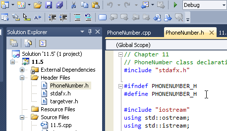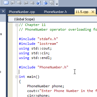 Sau đó, trong file định nghĩa các hàm thành viên của PhoneNumber, ta include thêm file PhoneNumber.h