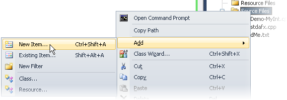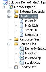 Như bạn có thể thấy, chúng ta sử dụng kỹ thuật #pragma once để tránh include quá nhiều thư viện Tương tự, hãy Add một file MyInt.cpp mới trong thư mục Source Files