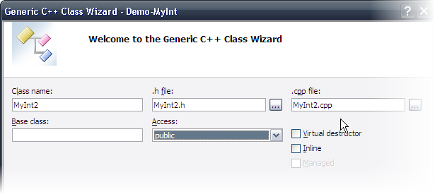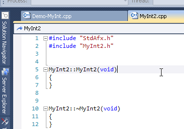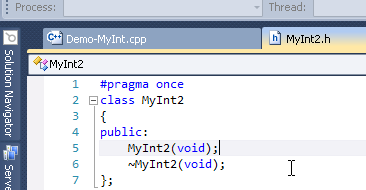 Một file mới hoàn toàn có tên MyInt.h được tạo ra. Đây là file dành cho việc khai báo class MyInt. Bạn cũng có thể định nghĩa class trong file này, nhưng việc đó không được khuyến cáo