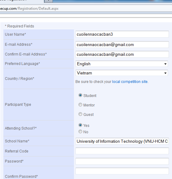 School Name, chọn là University of Information Technology (VNU-HCM City). Nó sẽ hiện ra cho bạn chọn khi đăng gõ