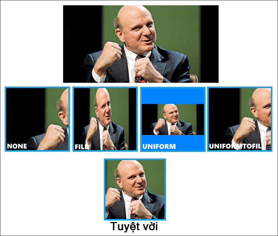 Image Control có một số thuộc tính về hiển thị như Stretch, Fill, Uniform, UniformToFill. Uniform To Fill sẽ mở rộng tấm hình ra cho vừa kích thước của control, và thực tế là nó cắt mất một góc trái trên của tấm hình, cho ta có cảm giác như tấm hình được canh giữa