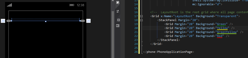 Như vậy, với 4 cái Grid ở trên đều không có kích thước, tức là sẽ có kích thước mặc định. Nếu 4 Grid đó được chứa trong 1 Grid lớn, thì nó sẽ được tự động bung ra tràn đầy Grid mẹ. Nhưng với StackPanel, 4 Grid này sẽ bị thu nhỏ lại thành 0.